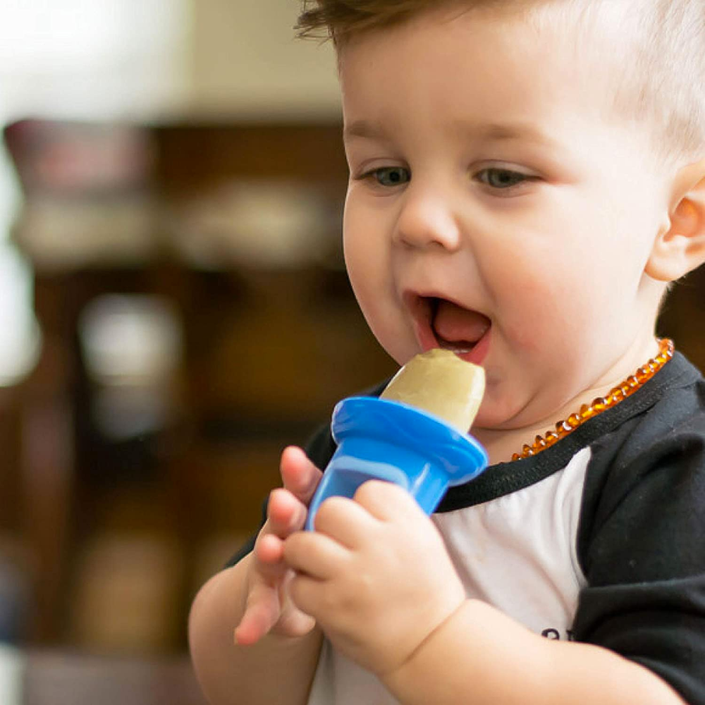 "They’re great for my 8 month old! Although I don’t really like that she can’t eat every last bit because the remaining food gets lodged at the bottom where the stick is. Other than that they’re great little popsicle makers for teething babies!" Amazon Review by Beatriz