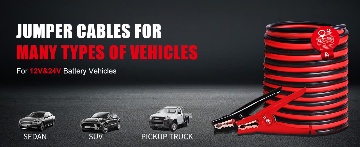 Ideal for 8.0L gas and 6.0L diesel engines, these jumper cables are suitable for 12V and 24V vehicles, including freight hauling vehicles, trucks, minivans, large SUVs, and mid-size cars.