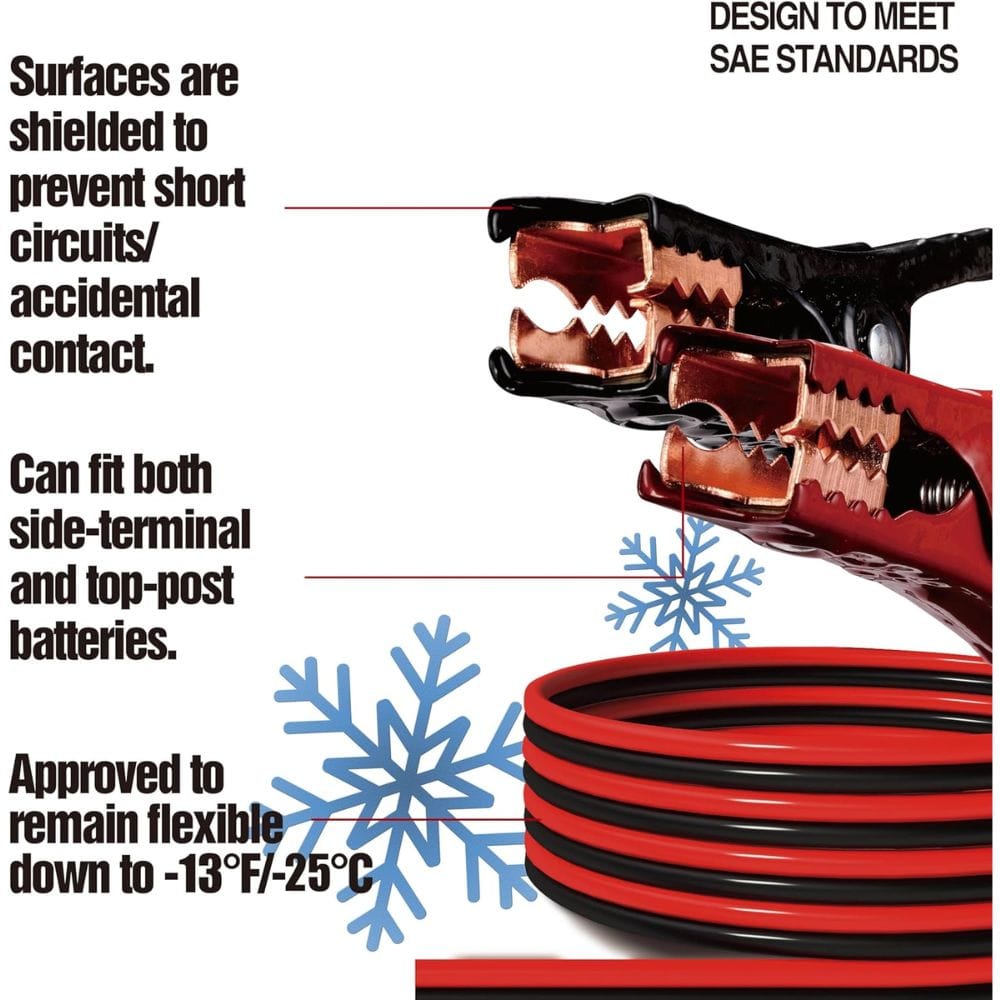 The 20-foot length of these copper-clad aluminum (CCA) cables allows you to easily reach from one car battery to another. They remain flexible even in extreme temperatures as low as -40°C.