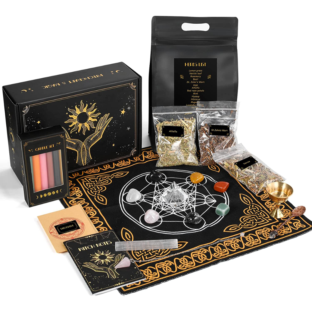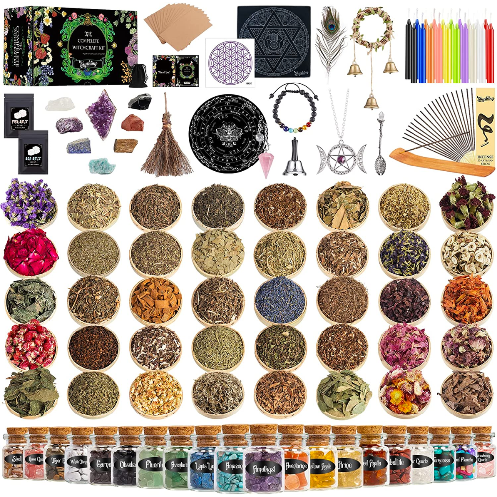 Witchcraft Kit for Beginners. A Practical and Complete Set for Your First Years of Witchcraft. This is an all-in-one kit with everything you need to start practicing Witchcraft. The kit include 14 witches herbs, 7 crystals, 12 witch candles, 20 sheets of parchment paper, 1 notebook, 1 selenite stick, 1 altar cloth, 1 crystal pendulum, 1 crystal pyramid, 1 brass holy grail and a antique spoon.