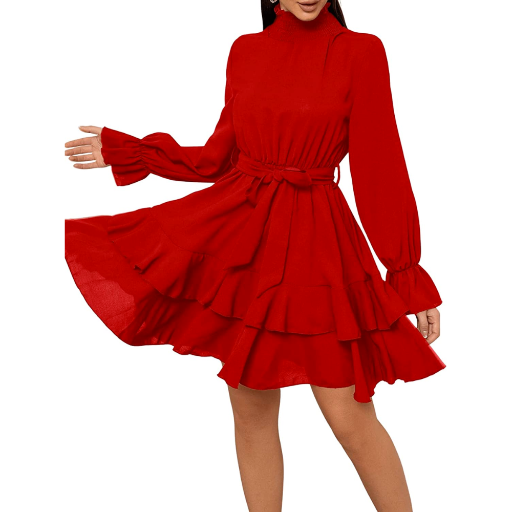 SweatyRocks Women's Elegant High Neck Flounce Sleeve High Waist Ruffle Belted Party Mini Dress