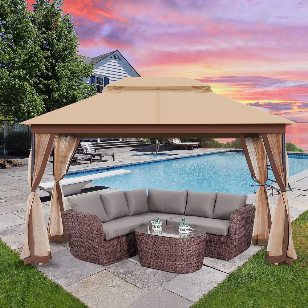 Aluminum Gazebo with Galvanized Steel Double Roof with Mosquito Net and Privacy Sidewalls