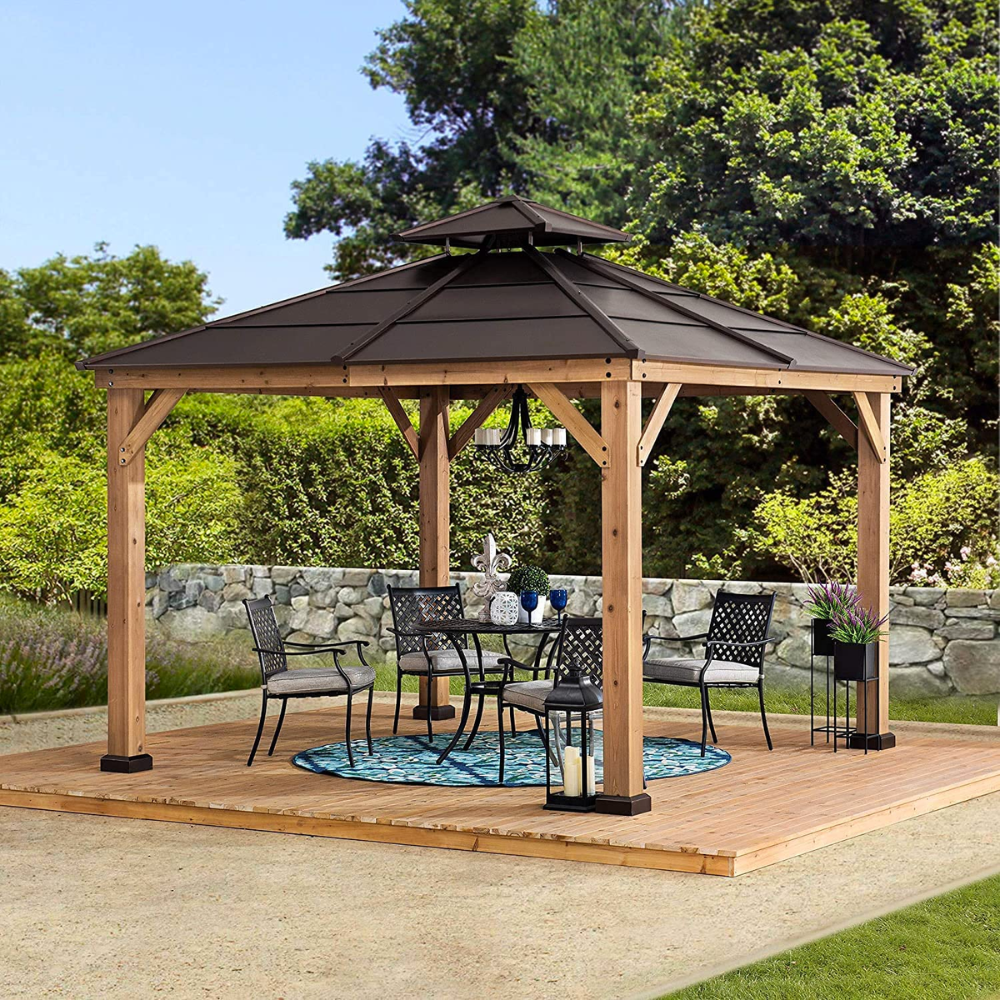 Sunjoy 11' X 11' Cedar Framed Wood Gazebo with Brown Double Steel Hardtop Roof Permanent Canopy for Garden