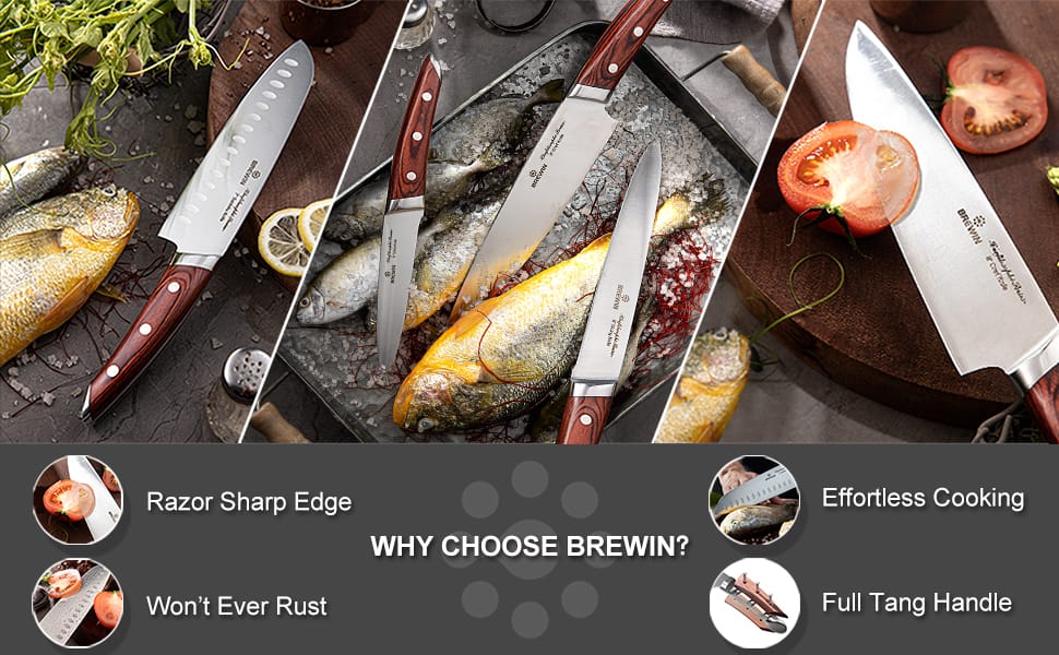 Unlike other chef knives, the Chefilosophi Series from Brewin features perfectly balanced handles for easier grip. With luxurious pakkawood natural texture and three reinforced anchor points, our chef knife set is engineered to last a lifetime.