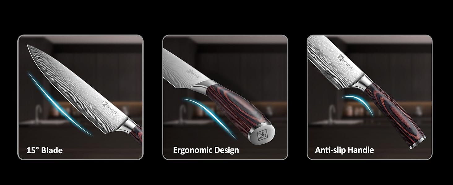 The PAUDIN kitchen knife is your go-to tool for effortlessly cutting bread, vegetables, fillets, meats, and more. Whether you're a home cook or a professional chef, this knife enhances your culinary experience, allowing you to cut like a master chef and bring more joy to your kitchen.
