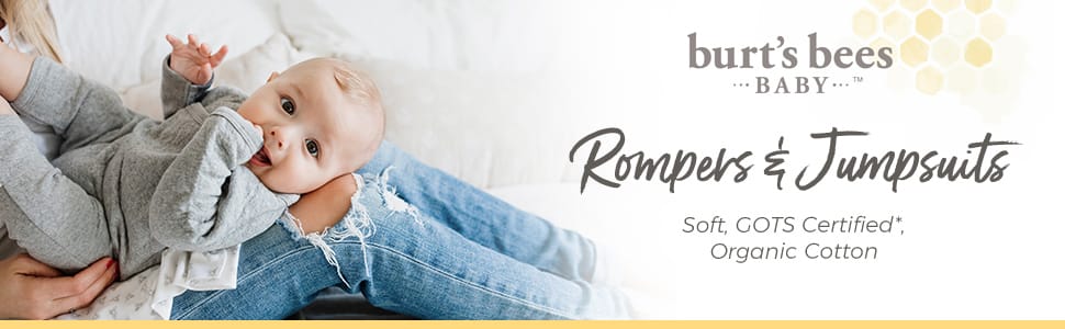 Dress your baby in Burt's Bees Baby rompers. These one-piece Jumpbees are cute and easy to wear. They come in fun prints and patterns with great features. These rompers are made with 100% organic cotton. The soft fabric feels great on baby's skin. It is also strong enough to last wash after wash! Our cotton meets the highest standard for organic material. Look for GOTS certification number 831717.