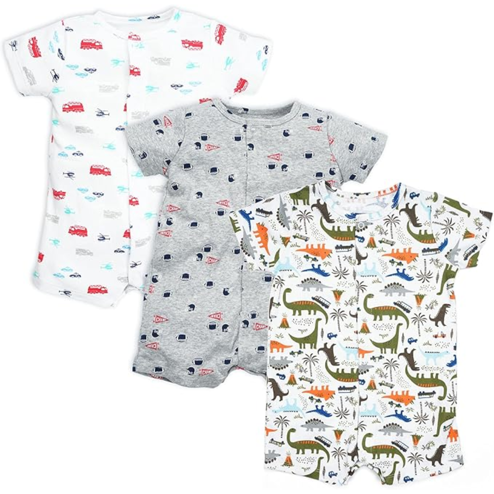 This set includes three baby rompers. They have inner thigh snaps and a back placket. This makes diaper changes quick and simple! The rompers are made with soft cotton. The breathable fabric is great for warm days.