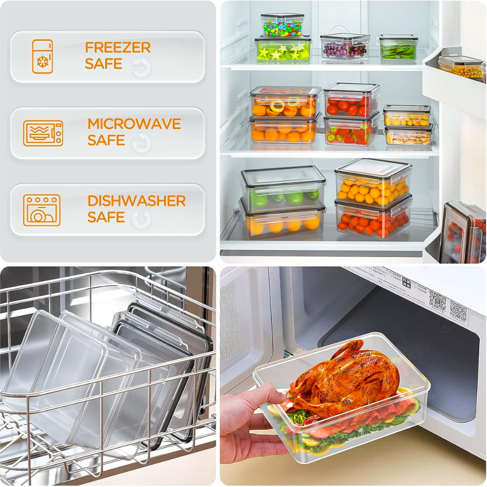 With leak-proof and airtight features, these food storage containers are equipped with a premium silicone seal and reinforced locking clips. Say goodbye to messy spills and unwanted food odors. Your food will stay fresh, organized, and secure.