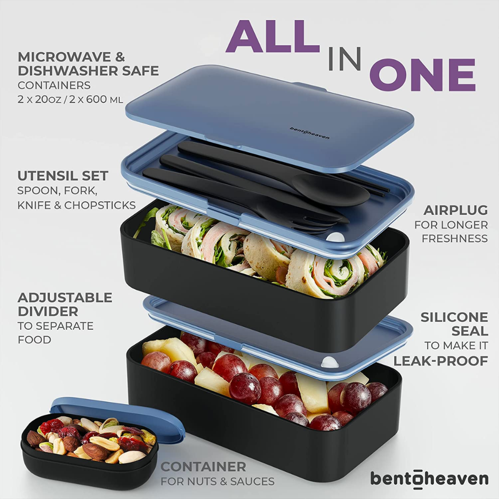 Bentoheaven Premium Bento Lunch Box in 8 Colors, 2 Compartments, Leakproof, Includes Dip Container, Divider, Cutlery & Chopsticks
