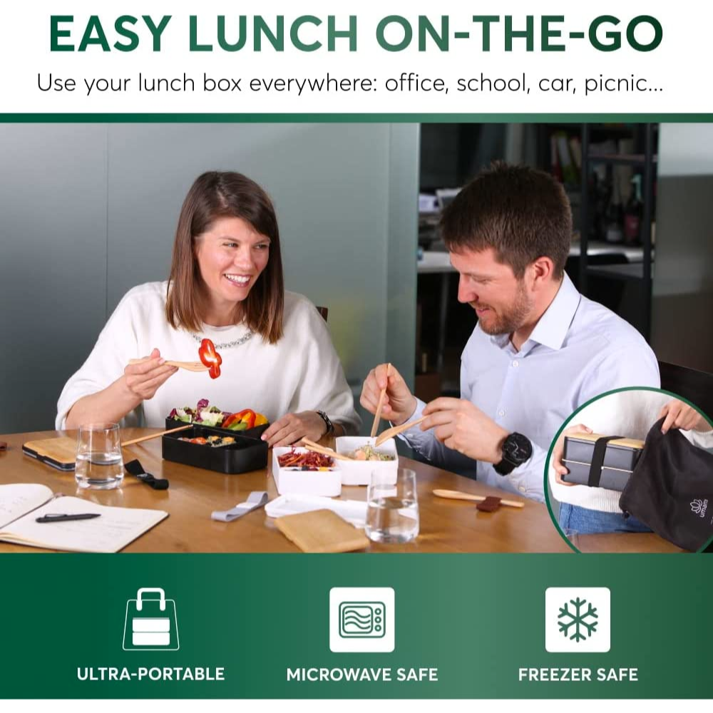 Modern Bento-Style Design Includes 2 Stackable Containers, Built-in Plastic Utensil Set, and Nylon Sealing Strap