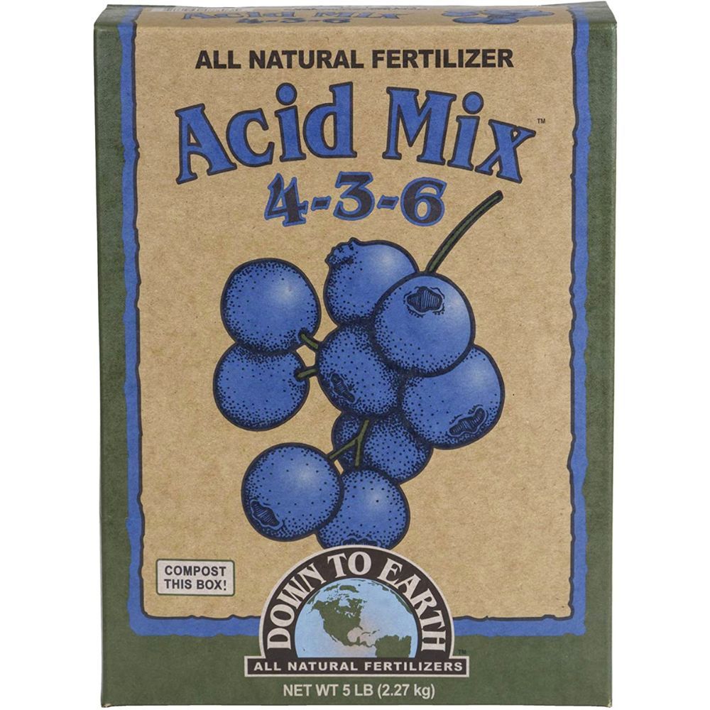 Down to Earth All Natural Acid Mix Fertilizer 4-3-6 is available in 5 pound bags.