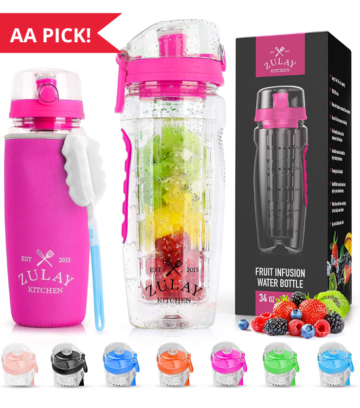 The Zulay Fruit Infuser Water bottle is the perfect way to get your fruit and water intake! This 34-ounce capacity bottle with sleeve is great for taking on the go, or just at home. The infuser allows you to add more than one type of delicious fruit into each drink and the sleeve is a great addition to prevent the bottle from sweating.