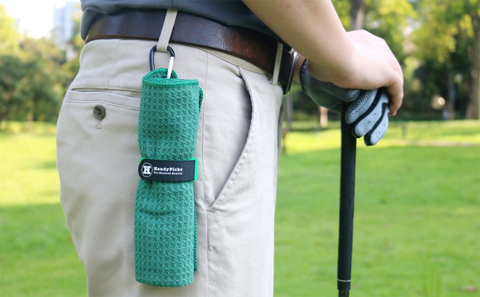 Handy Picks Microfiber Golf Towel (16" X 16") with Carabiner Clip, Waffle Pattern Hook and Loop Fastener