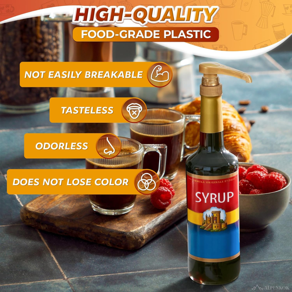 Our Premium Gold Pumps are designed to fit seamlessly with Davinci syrups and Torani 750ml bottles, ensuring effortless use with a variety of coffee syrup bottles and flavored water bottles.