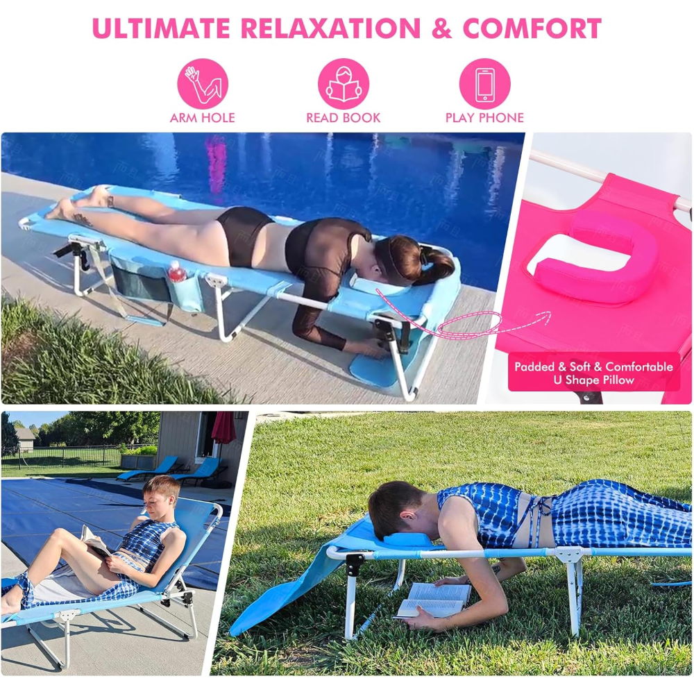 350lbs Beach Lounge Chair with Face Hole, Washable Pillow & Carry Strap