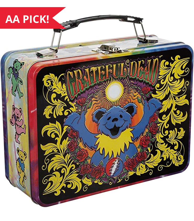Introducing the Grateful Dead Collectible Large Tin Tote! This limited-edition lunchbox is perfect for any Deadhead. The exclusive Grateful Dead artwork is sharp and vibrant, and the collapsable handle makes it easy to carry. The high-quality tin metal and heavy-duty plastic make this lunchbox durable and collectible. So grab one before they're gone and store your mix tapes or anything else in true Deadhead style!