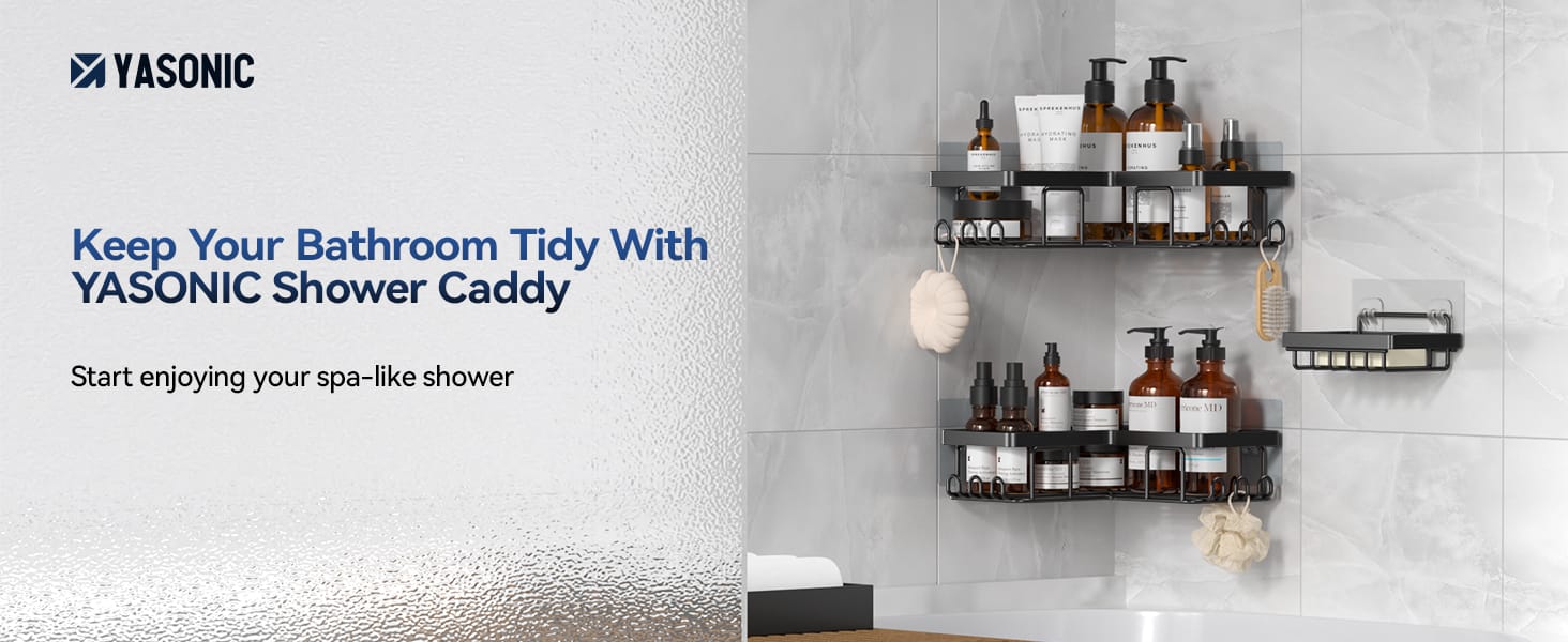 YASONIC Corner Adhesive Shower Caddy, with Soap Holder and 12 Hooks
