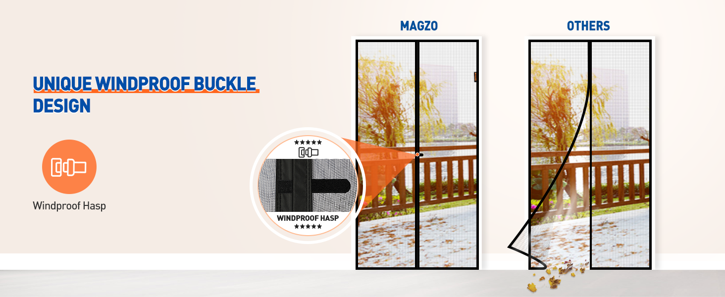 - Exclusive Windproof Fastener: Equipped with a specially designed hook and loop system located at the middle and bottom sections of the screen. This feature significantly enhances the stability of the screen door against wind, preventing it from being blown open.
