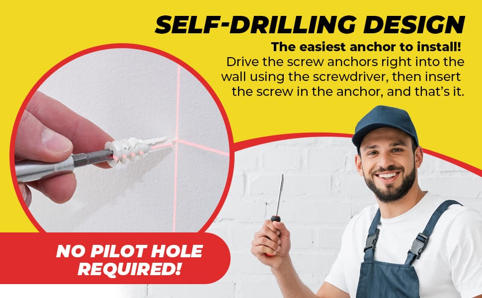 Unlike ordinary screws and anchors that bend and snap, the Crimson Mark drywall anchors and screws kit features well-designed, durable items. With sharp, pointed shanks, these anchors can be easily screwed into the wall without the need for pre-drilled holes, using just a screwdriver or screw gun, which also produces less dust.