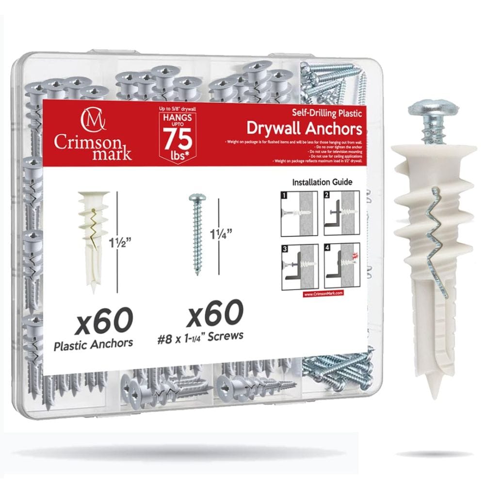 Buy with confidence today. Thanks to their reliable quality and durability, you can use our drywall screws and anchors set to securely hang your objects. Each set includes 60 plastic wall anchors, 60 galvanized screws, and 1 attractive clear plastic organizer box. The 120-piece set comes neatly packaged in a reusable case.