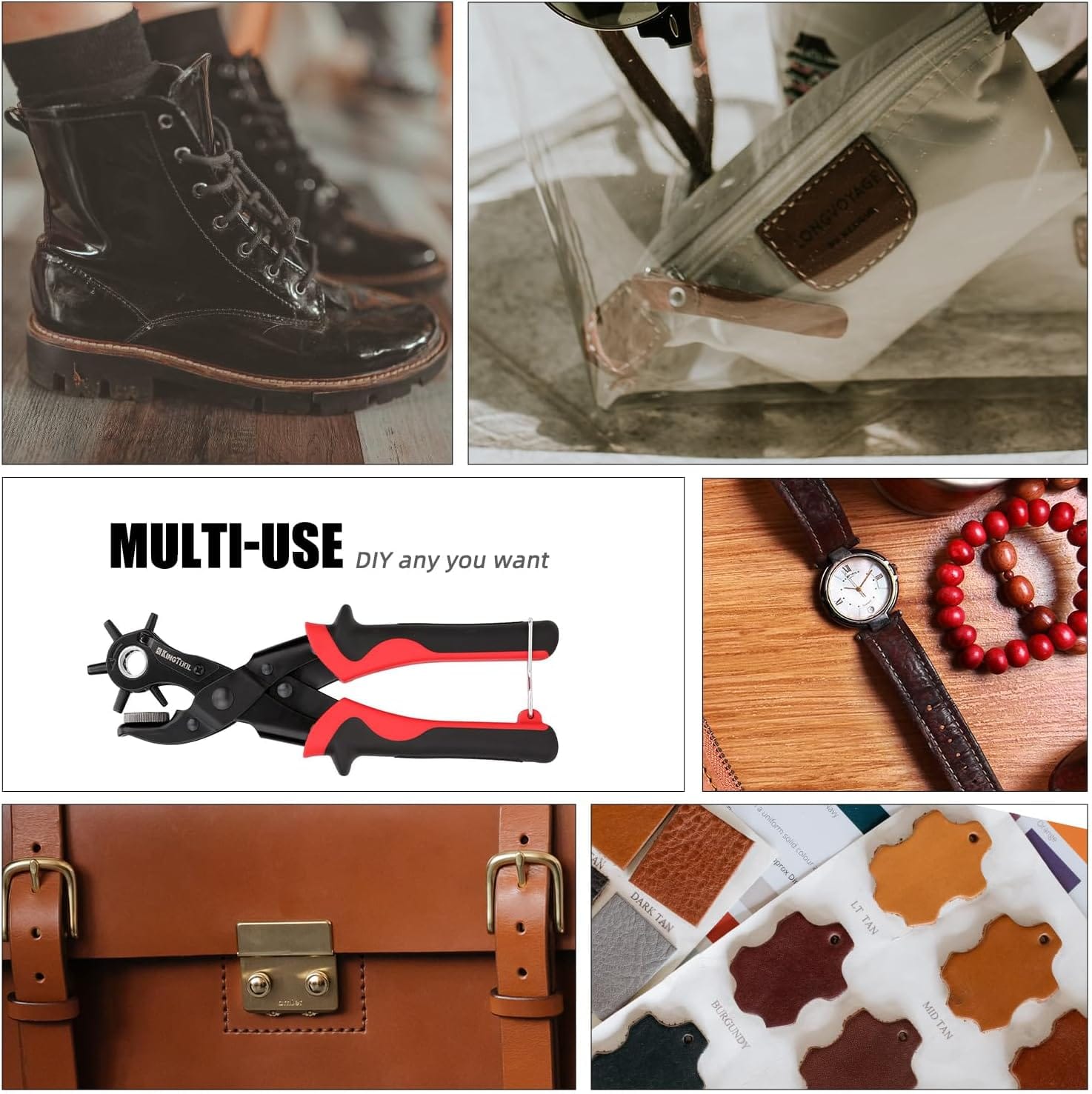 This multi-tool works great on many things. It’s an awesome tool to have. The punch plier makes round holes. People use it on leather and belts. It also works on plastic, rubber, and canvas. Fabric, cardboard, and saddles are good, too. It is super useful as a leather hole punch.