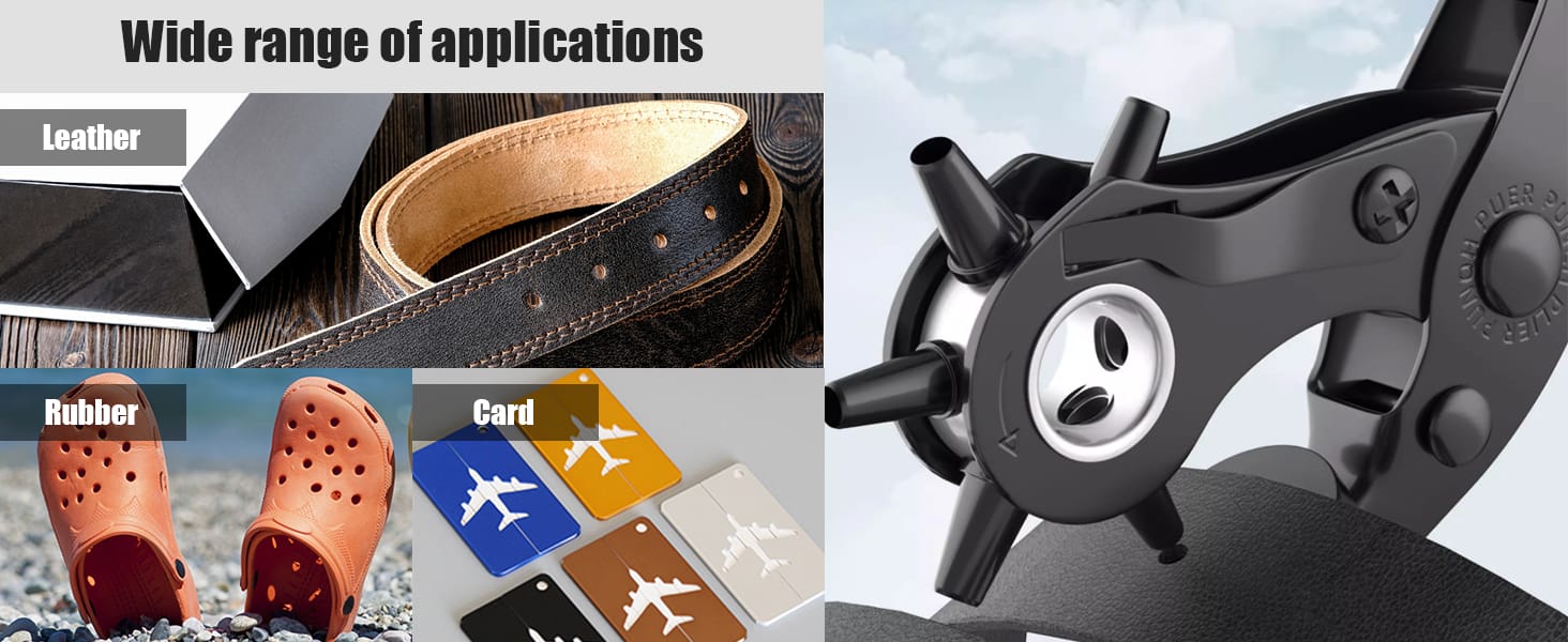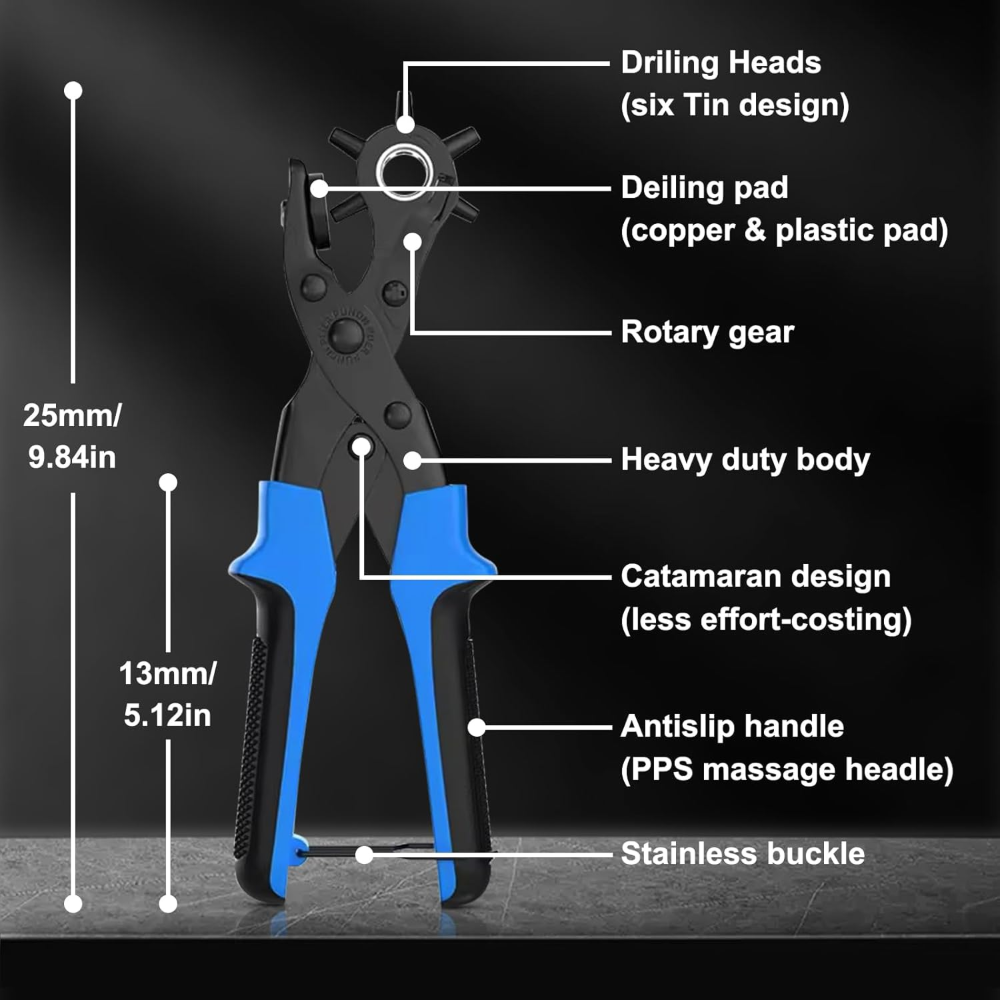 This tool features six different sized hole punch heads. Sizes include: 2 mm, 2.5 mm, 3 mm, 3.5 mm, 4 mm, and 4.5 mm. These sizes meet various project needs. It's great for making round holes. Use it on leather, belts, plastic, rubber, canvas, or fabric. You can even use it on cardboard or saddles. It works well on similar stuff. It's perfect for leather projects. To use, pick the right size. Then, rotate the wheel. Line up your belt and squeeze. Now, your belt fits perfectly. It's super easy to use. You can get a custom fit at home.
