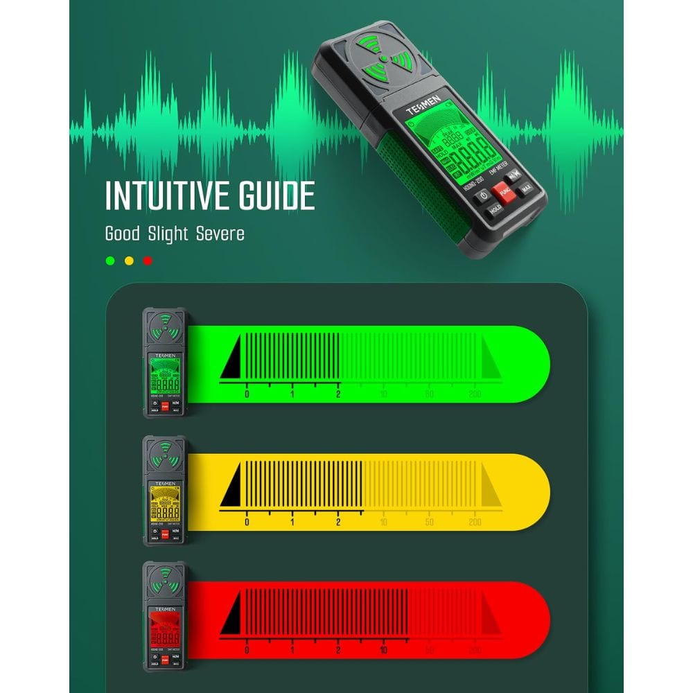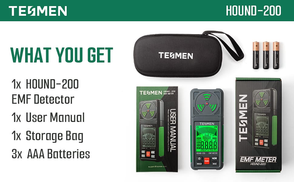 The TESMEN EMF Meter is designed to detect the strength of radiofrequency fields (RF), electric fields (EF), and magnetic fields (MF). With a built-in electromagnetic radiation sensor, it ensures precise electromagnetic field detection. Whether you're at home, engaged in outdoor activities, or pursuing ghost hunting, the Hound-200 EMF detector is a reliable tool for all your field detection needs.