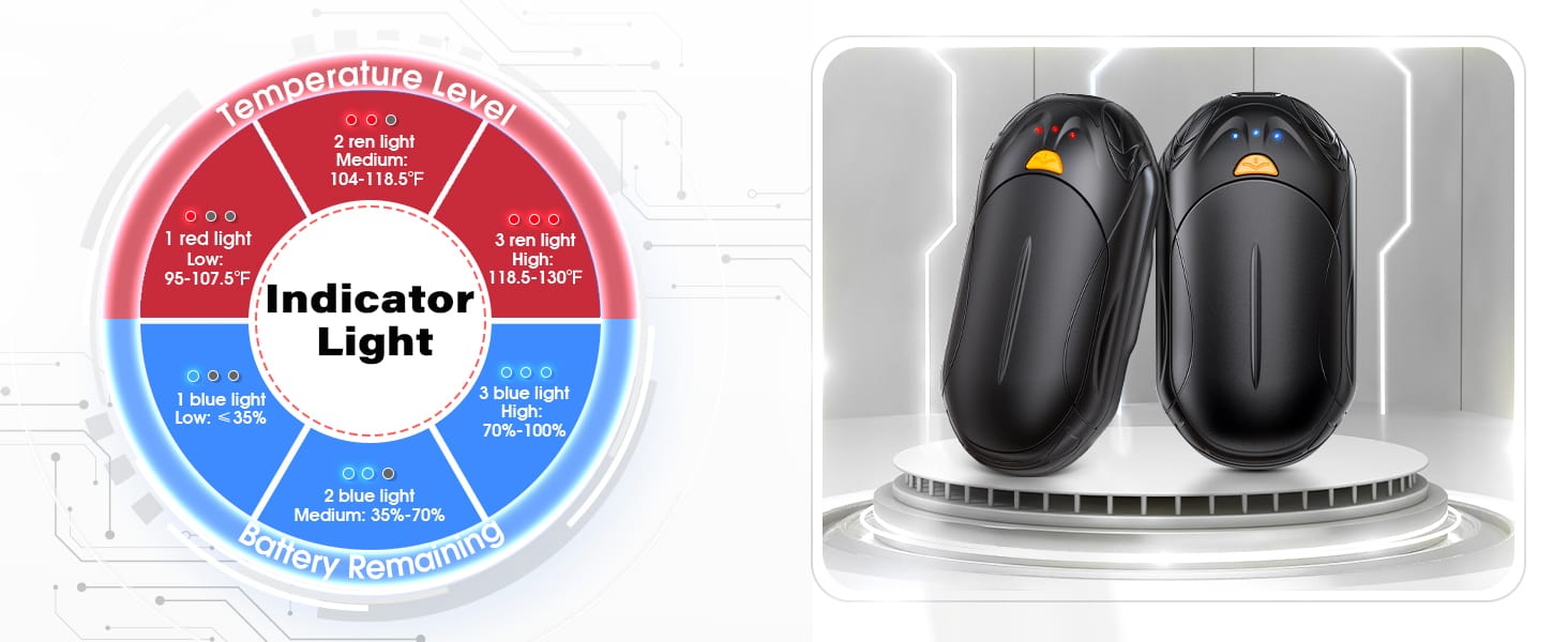 An indicator light displays the remaining power and current setting. Our rechargeable hand warmers are certified by CE, FCC, and UL tests. They include built-in protections against over-current, over-voltage, over-temperature, and short-circuit, ensuring safe use.