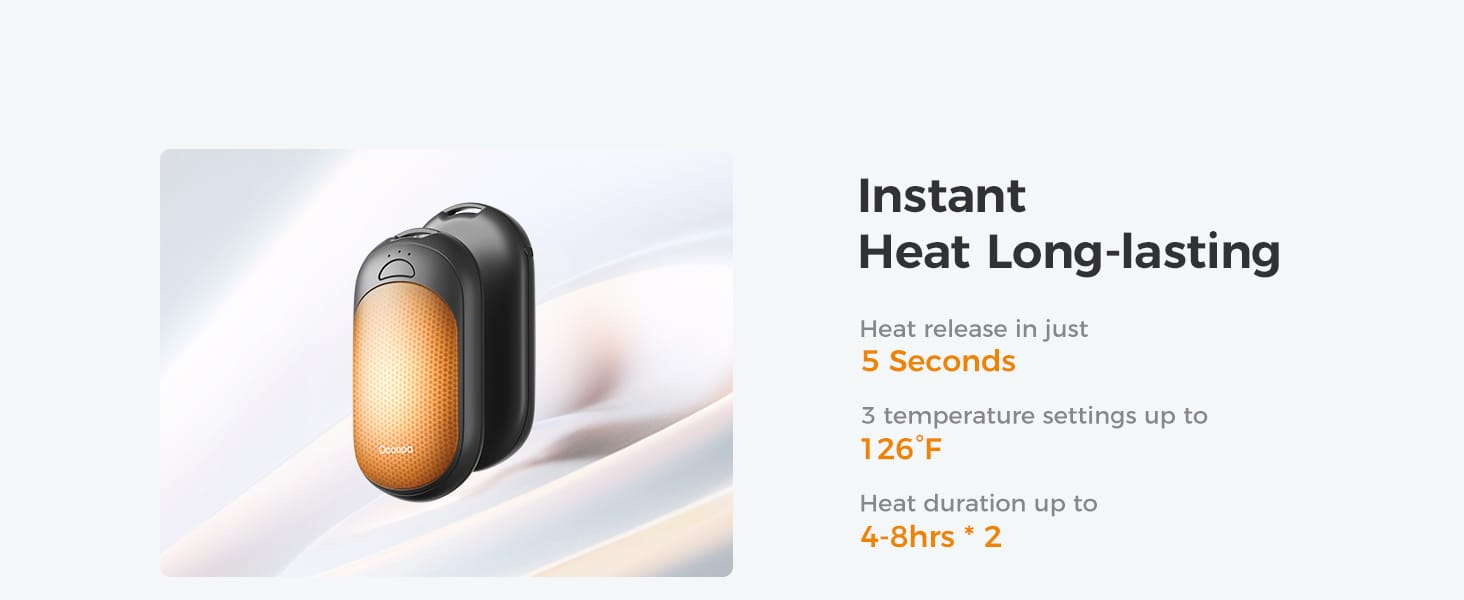 Our hand warmers heat up rapidly within just 3 seconds. They offer three heating settings: