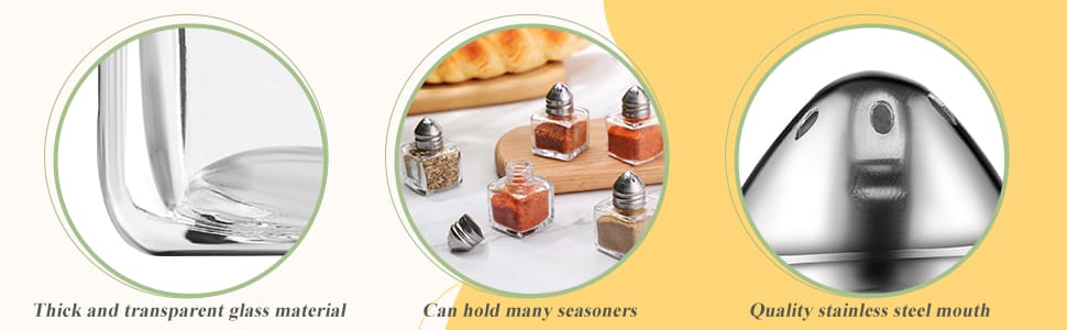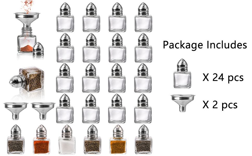 "I was hosting a large gathering with people sitting at multiple tables. I wanted salt and pepper to be available without them having to search the house so I ordered these. Of course other fine spices such as cinnamon could also be added to these. They were so easy to fill with the included little funnels. They looked great on the tables and did the job intended perfectly. I'm so glad that I had them." Amazon Review by J. R.