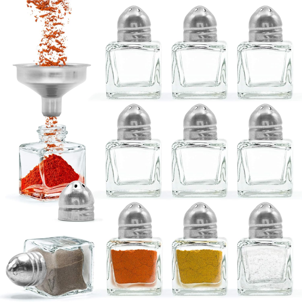 "I was hosting a large gathering with people sitting at multiple tables. I wanted salt and pepper to be available without them having to search the house so I ordered these. Of course other fine spices such as cinnamon could also be added to these. They were so easy to fill with the included little funnels. They looked great on the tables and did the job intended perfectly. I'm so glad that I had them." Amazon Review by J. R.