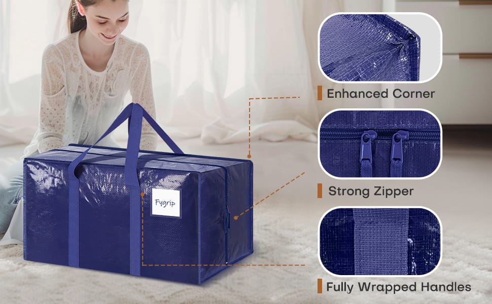 Fygrip moving bags are crafted from upgraded 180 GSM extra-thick coated PE fabric, ensuring durability and strength. Featuring fully wrap-around handles, a robust zipper, and reinforced stitching, these bags are designed to securely hold over 65 lbs. Ideal for moving and storage, Fygrip bags offer reliability and peace of mind.