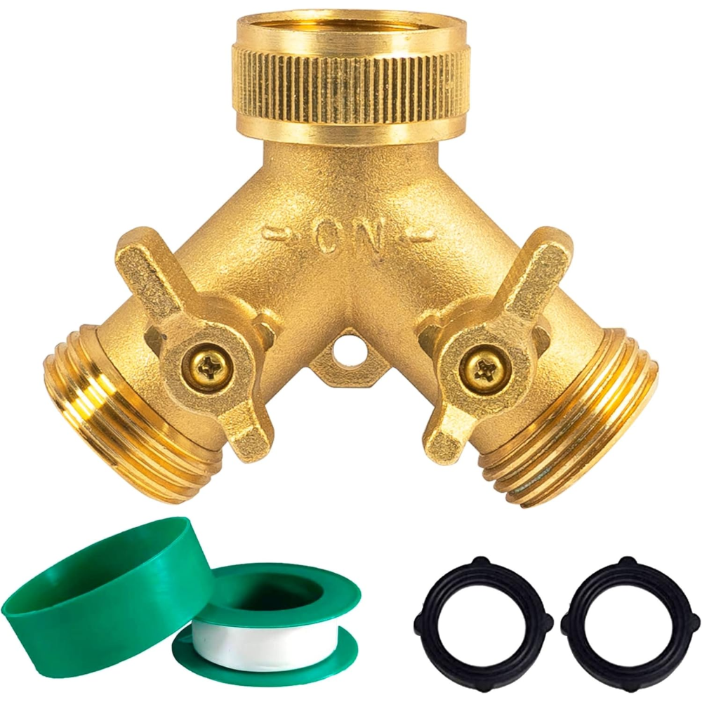 Solid Brass Hose Y Splitter 2 Valves with 2 Extra Rubber Washers (Brass)