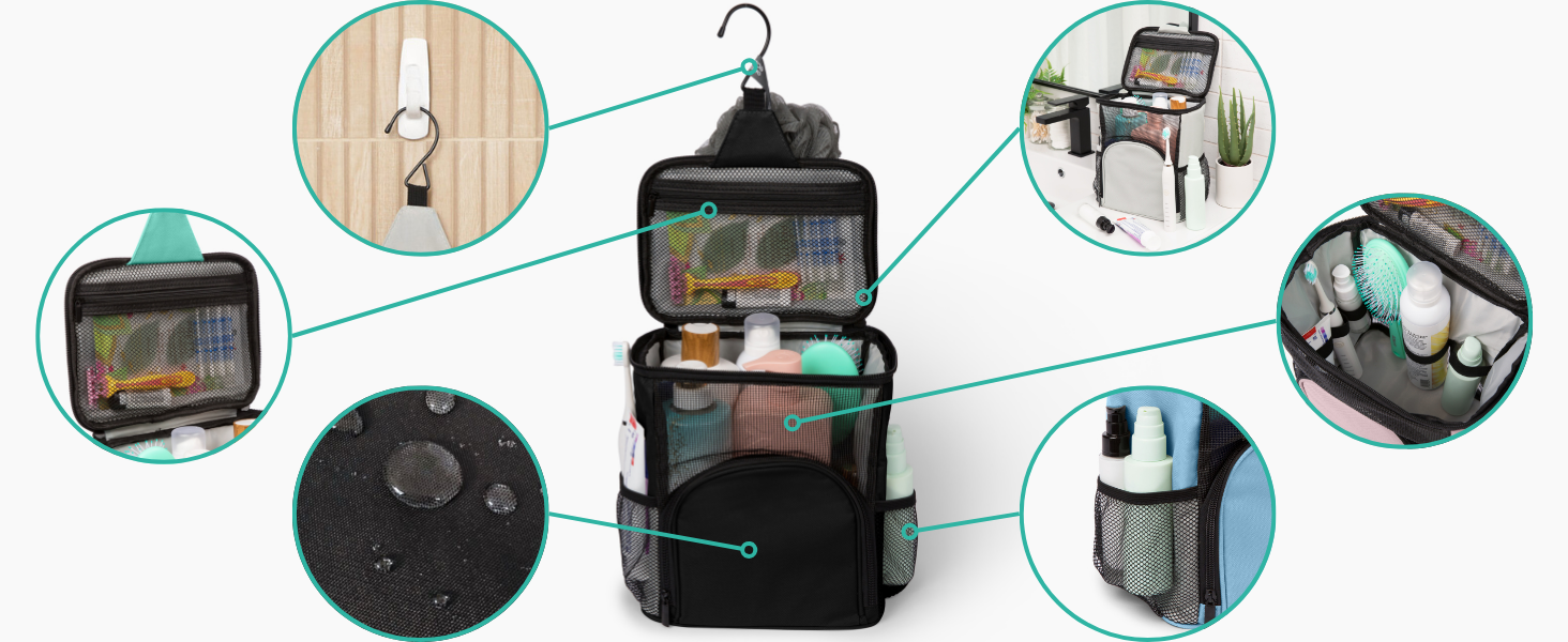 Ideal for summer camps and travel, this travel shower caddy serves as your ultimate toiletry bag. Despite its compact dimensions (9.75"H x 8.35"L x 5.75" W), it is spacious enough to accommodate up to four full-size bottles of your essential bathroom products such as shampoo, conditioner, lotion, and body wash. It's a travel essential that ensures you have all your necessities within reach.