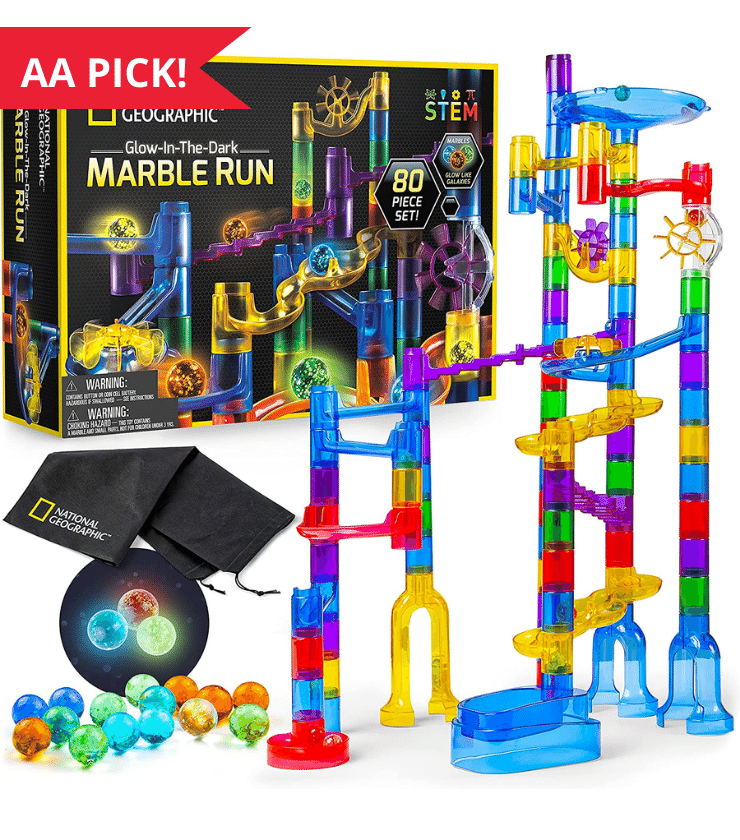 Introducing the National Geographic Glowing Marble Run! This exciting new toy is sure to provide hours of fun and learning for kids of all ages. With its easy-to-use pieces, the Glowing Marble Run can be configured in any design you can imagine. The detailed learning guide included with the set provides valuable information about the physics of motion and gravity, so kids can learn while they play. And when they're done, the storage bag ensures that all the pieces stay together. The Glowing Marble Run includes: 15 glow-in-the-dark marbles; 1 UV light to help your marbles glow brighter, longer; 45 smooth-run tube pieces; 15 action pieces that fit securely together; 5 sturdy bases; storage bag; and Learning Guide with instructions. Get your National Geographic Glowing Marble Run today and start building amazing marble run mazes!