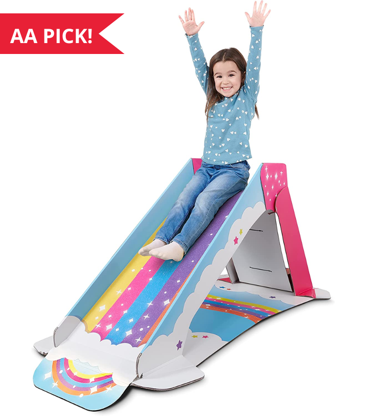 Looking for a fun and easy way to keep your kids entertained? Look no further than the Pop2Play Kids Slide Indoor Playground! This storable, adorable, pop-up playset can be assembled in under 5 minutes and folds flat for easy storage, making it the perfect solution for parents on the go. Made with super durable StrongFold™ technology, the Pop2Play Rainbow Slide can hold up to 50 lbs, and be wiped clean with ease. Not only is Pop2Play made with eco-friendly materials, you can also recycle your Rainbow Slide when you’re done popping up the fun! Ideal for kids aged 2-5, it’s the first of its kind play set that can transform any living space into the perfect playroom and then folds flat behind, or under, any couch or bookcase out of the way! Each Pop2Play Rainbow Slide comes with 1 fully assembled slide.