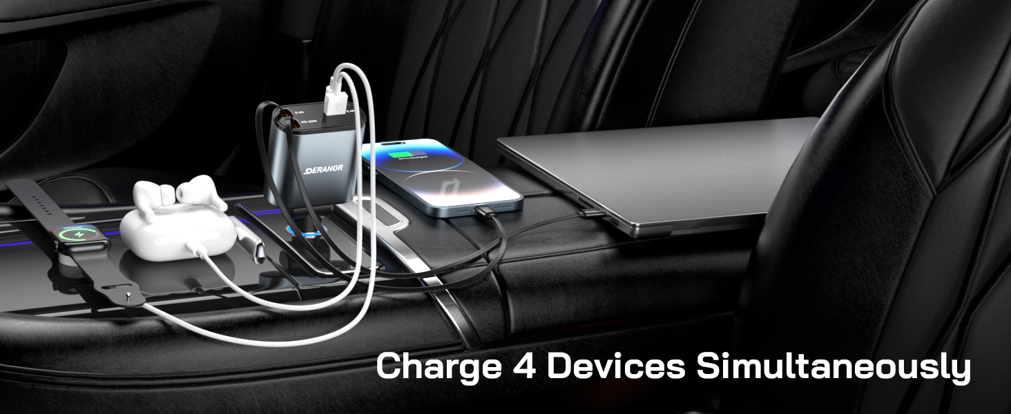 Our USB-C car charger is designed to meet all your charging needs efficiently. Equipped with a real PD 30W USB-C port, 12W USB Lightning cables, a 15W USB-C port, and a 12W USB-A port, this versatile charger allows fast charging for up to four devices at once. Say goodbye to clutter and multiple chargers—experience the convenience of a single, compact solution for all your devices.