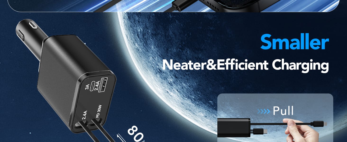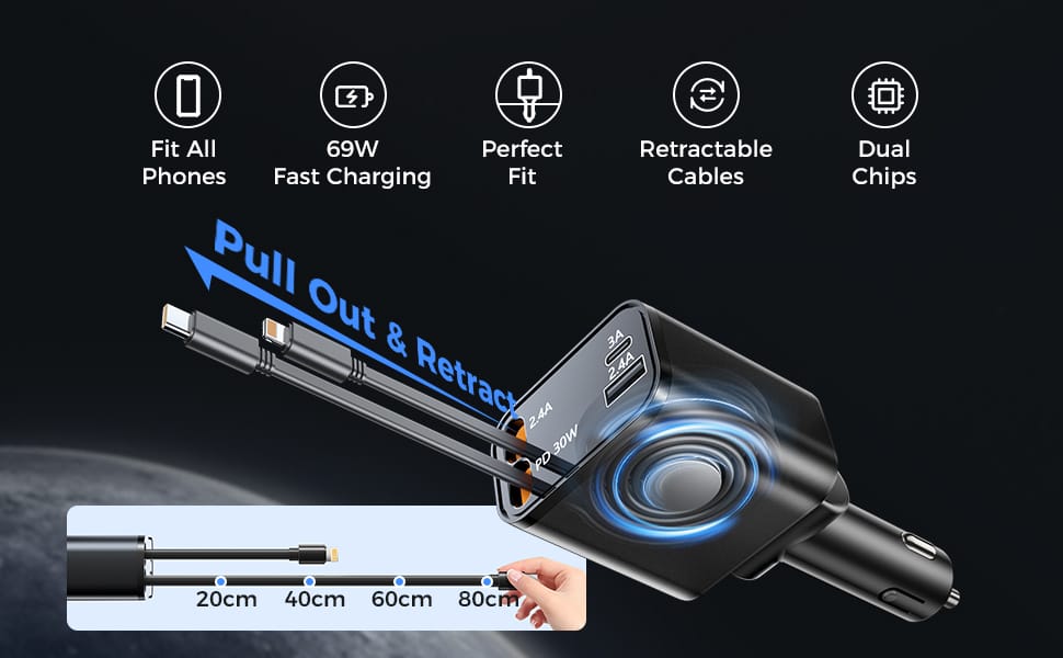 The 4-in-1 car charger is designed to enhance your in-car charging experience with its innovative features. It includes two retractable cables that extend up to 31.5 inches (80 cm) and automatically retract for easy storage, reducing clutter in your vehicle.