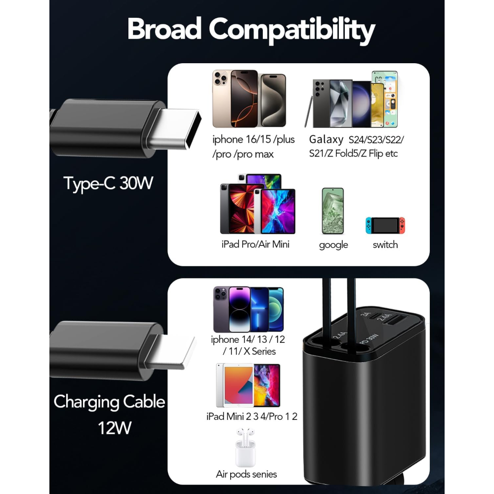 The retractable car charger is designed to ensure your devices are fast charging efficiently and consistently. This versatile car charger USB-C features both USB-A and USB-C ports, making it compatible with all plug cables, including those for iPhones and other smartphones.