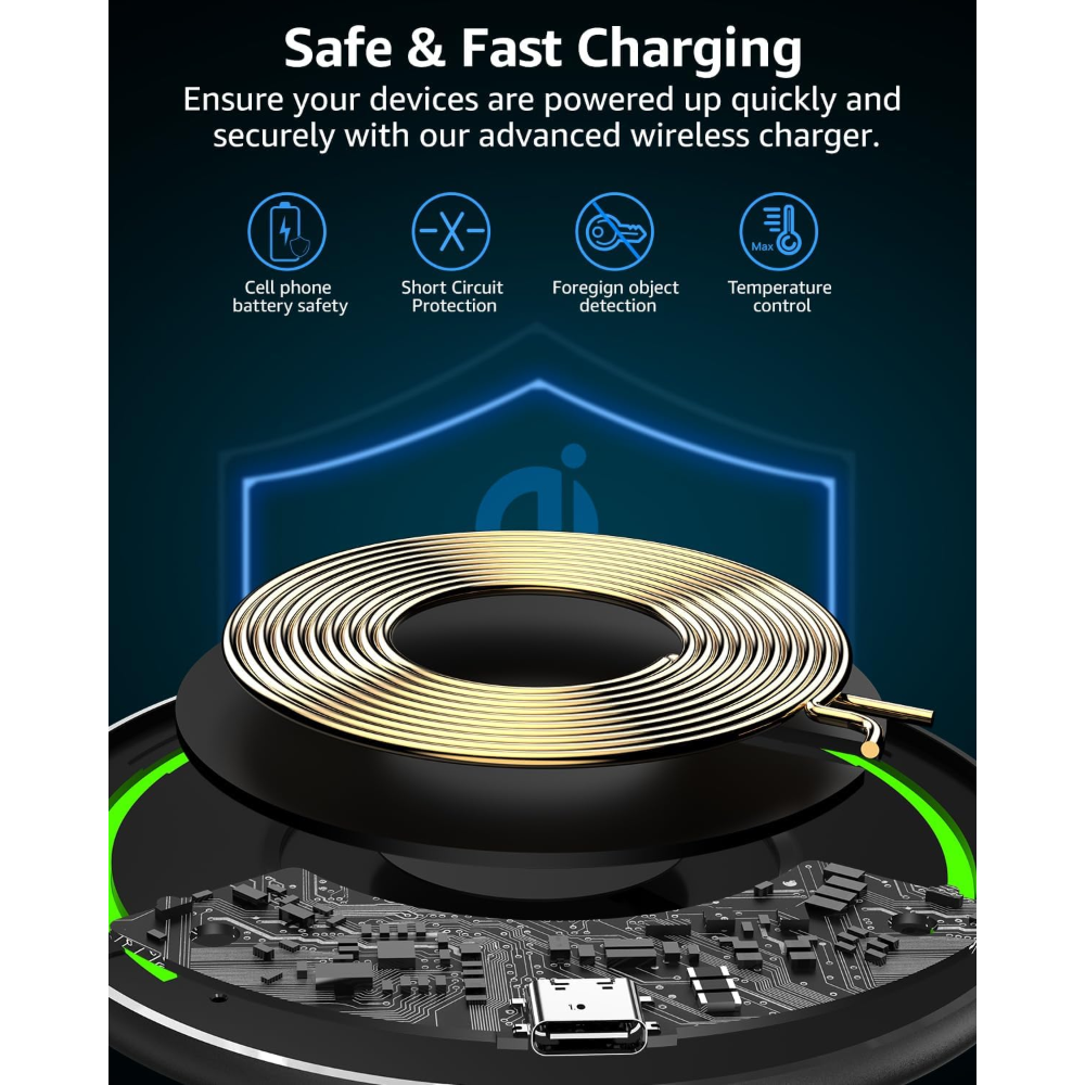 Charge safely with our device. It has a smart chip inside. This chip knows when something is not right. It can tell if a foreign object is present. It prevents overheating. It also protects from too much current, voltage, and short circuits. Feel safe charging your phone overnight on your nightstand. Feel safe charging it all day at work on your desk. The built-in protection gives you a better, safer way to charge. Imagine placing your keys or loose change on the charging pad by mistake. The foreign object detection kicks in, preventing the charger from activating and potentially damaging your belongings. Overheat protection stops charging if your phone gets too hot, helping extend your battery life. These features offer peace of mind.