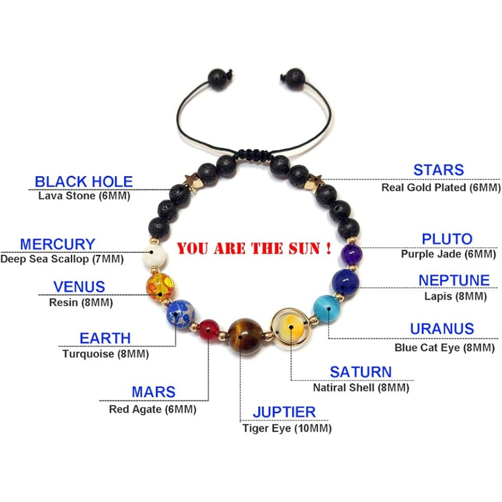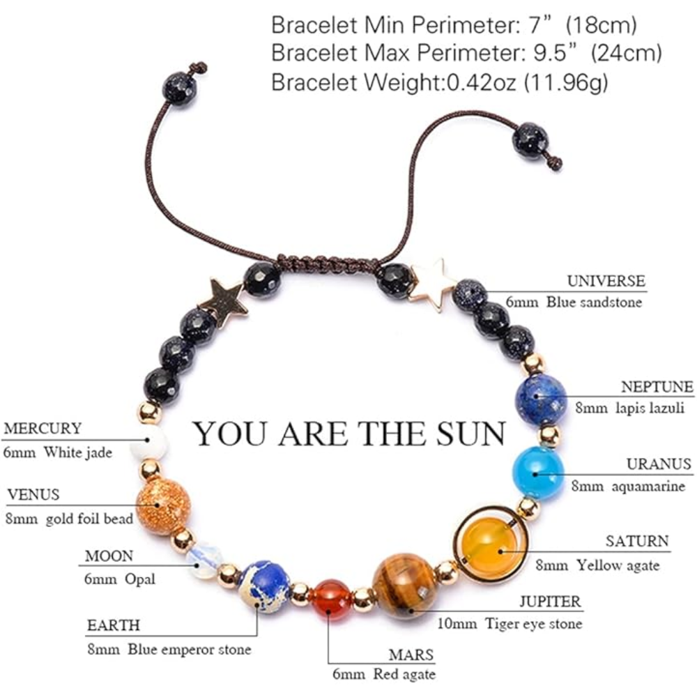 Discover the Solar System Planet Bracelet, a unique accessory designed to symbolize your central role in the universe, much like the sun. This bracelet aligns the planets and stars around you, channeling positive energy and harmony. When you wear it, envision yourself as the sun, surrounded by eight planets and stars, radiating warmth and balance.
