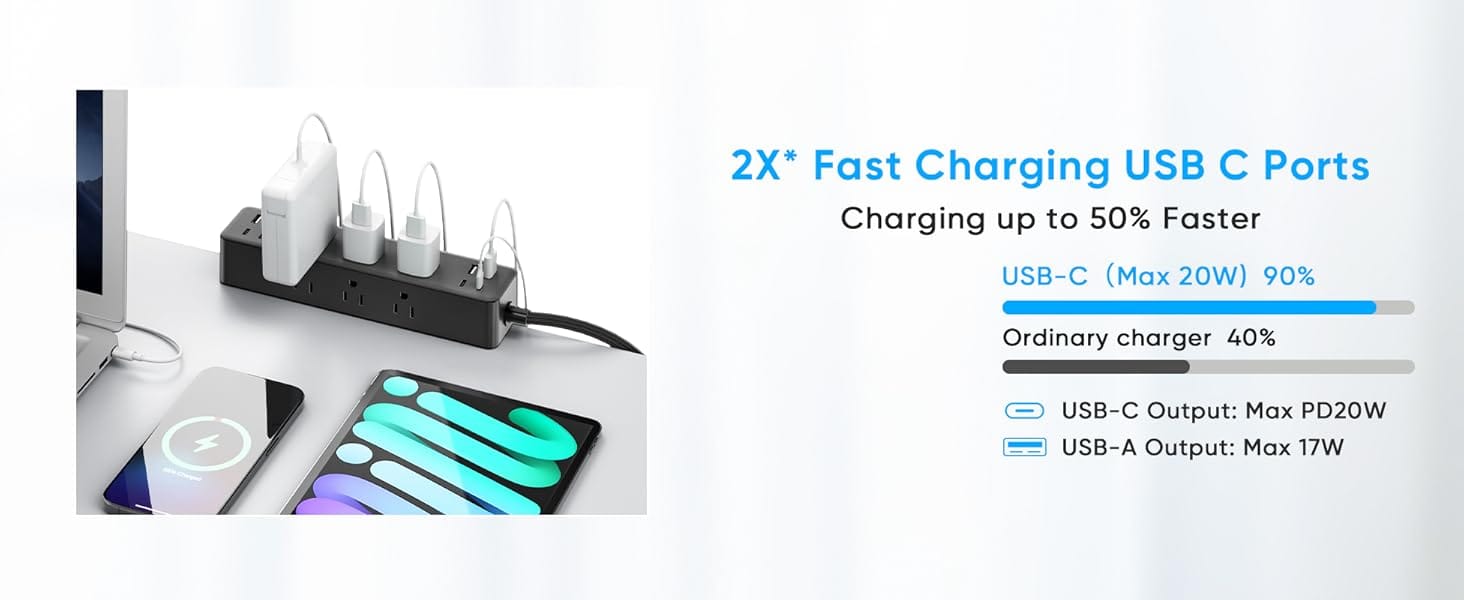 - Comprehensive Charging Ports: Equipped with 2 PD 20W USB C ports, 2 USB A ports, and 3 standard outlets, this power strip provides easy plug-in access for all your devices.