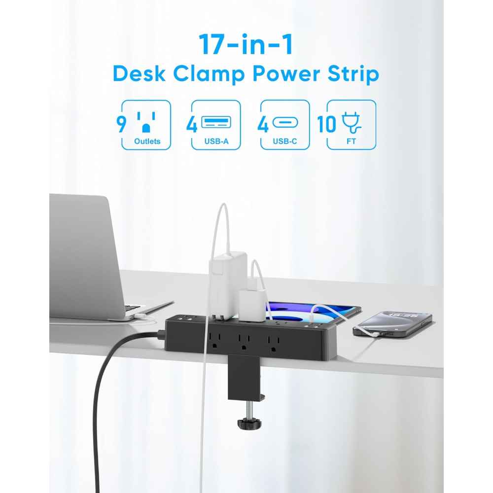 The 17-in-1 Desk Clamp Power Strip and Multi-purpose charging station offers an efficient solution for powering multiple devices simultaneously. This innovative product combines two distinct power strips into one functional unit. It features an impressive total of 13 AC outlets alongside 4 USB ports, which include 2 USB-C options. This design allows users to connect and power up to 17 different devices at the same time, significantly enhancing productivity and saving time during busy work hours or while traveling.