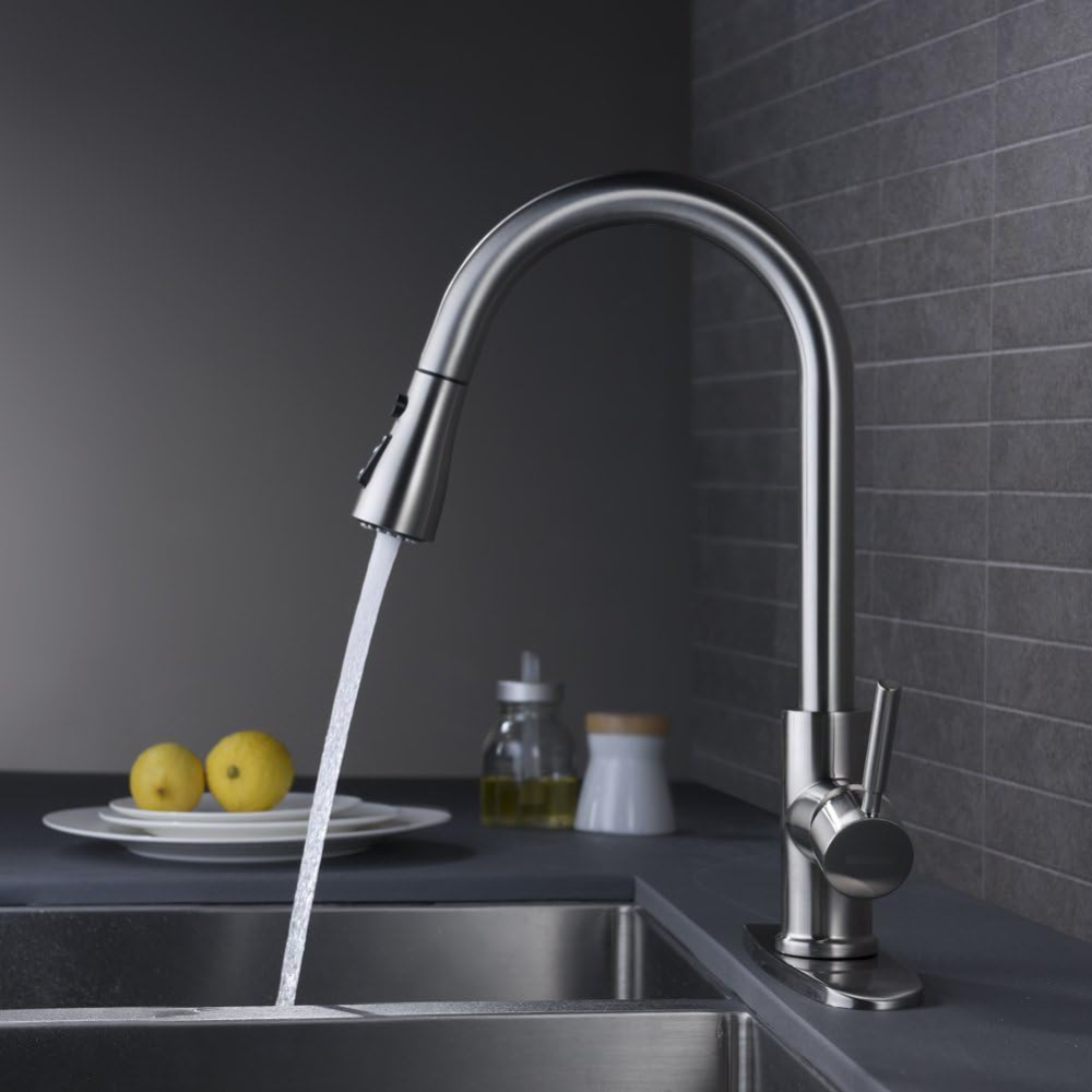 Upgrade your kitchen experience and enjoy the functionality and beauty of the WEWE Single Handle High Arc Brushed Nickel Pull Out Kitchen Faucet today!