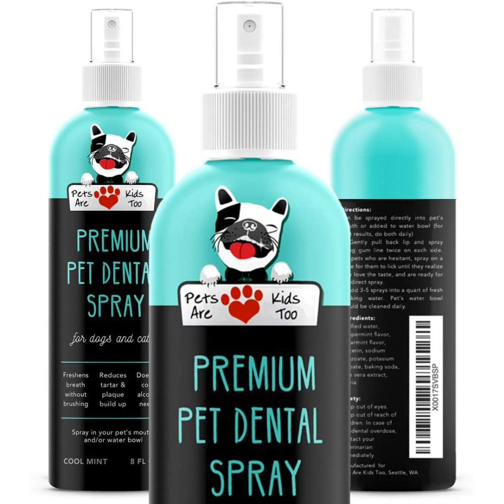Pets Are Kids Too Premium Pet Dental Spray is a powerful breath freshener that not only remedies bad dog breath, but also transforms it into fresh, puppy breath - on contact! It's safe to use, contains no toxic grain alcohol or pesticides, and has a taste dogs love.