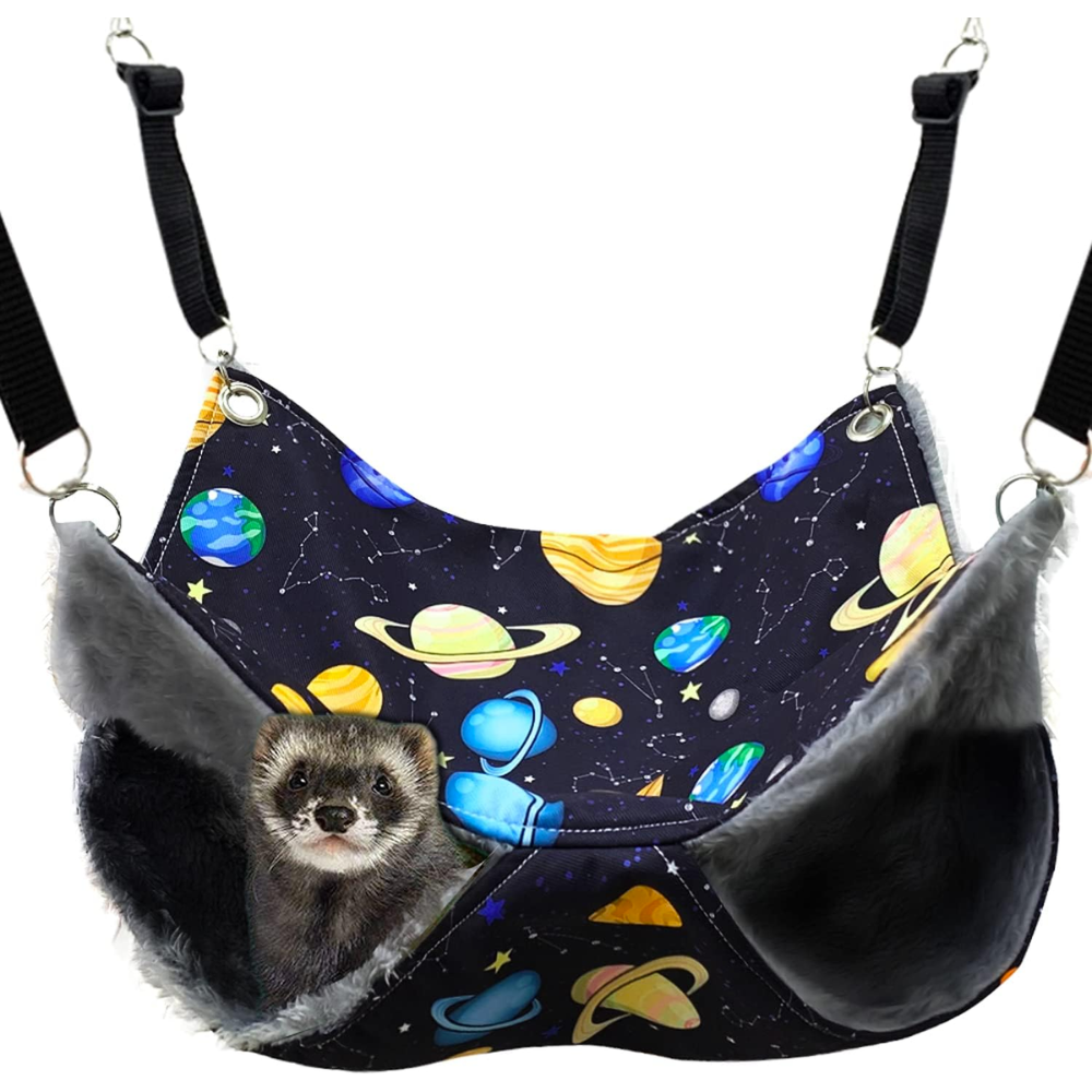 FULUE Ferret Hammock is the perfect way to give your furry friends a comfortable spot to relax. It's made of waterproof canvas outside and warm fleece inside, with metal clips & clip connectors to keep small pets from chewing on it. Plus, its 2-in-1 design converts to a hammock or sleeper bag so your pet can either lay on the top or curl up inside. Perfect for ferrets, rats, guinea pigs, and other small pets—it's the ultimate pet toy!