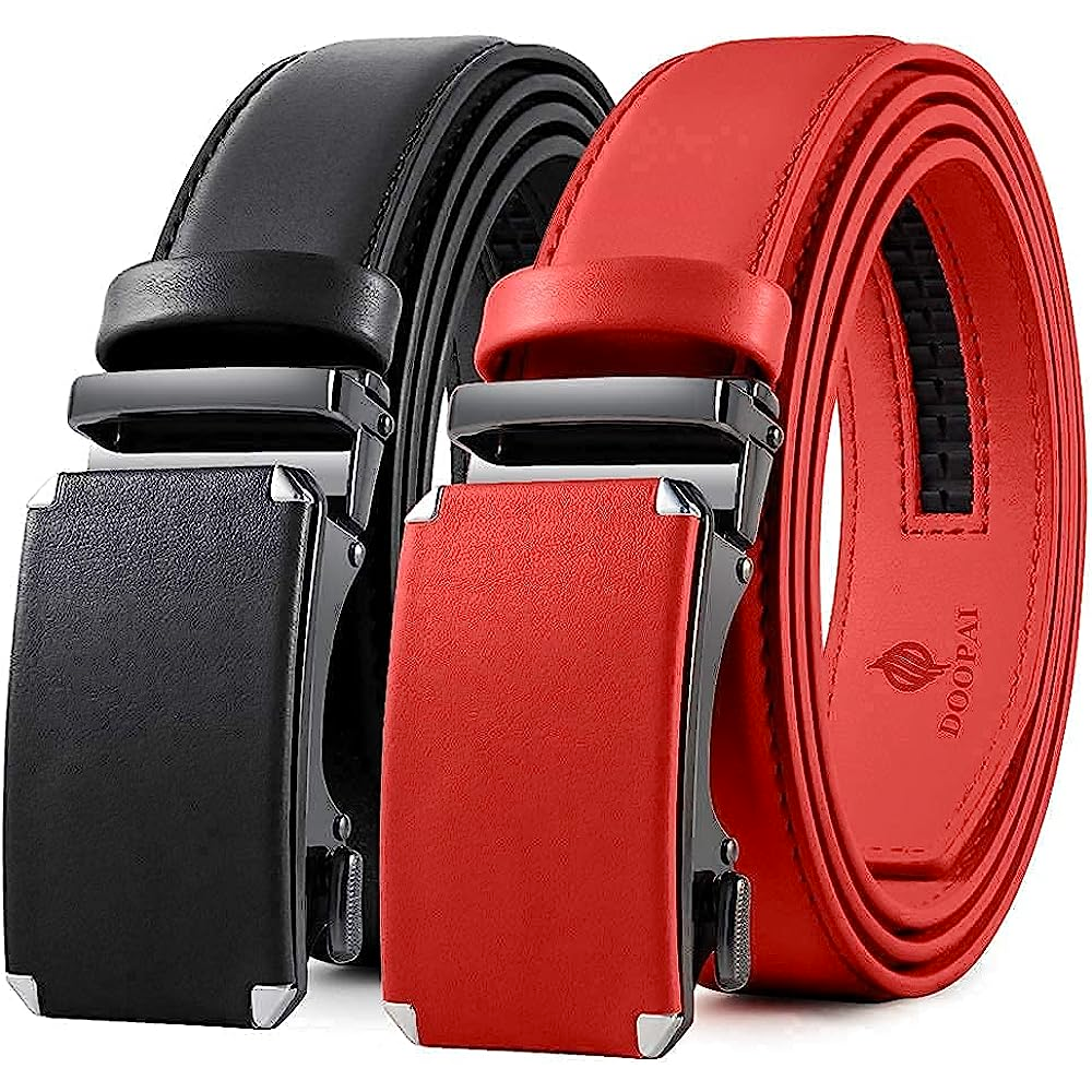 Upgrade your wardrobe with DOOPAI's genuine leather ratchet belts. Get a perfect fit every time and look sharp no matter the occasion. Our stylish and easy-to-use click-on buckle will keep your belt snug and comfortable, while the variety of colors available will allow you to match any outfit or wardrobe. Stop worrying about finding the right size and spend more time looking great! With DOOPAI, you'll be sure to turn heads at just the right moments.