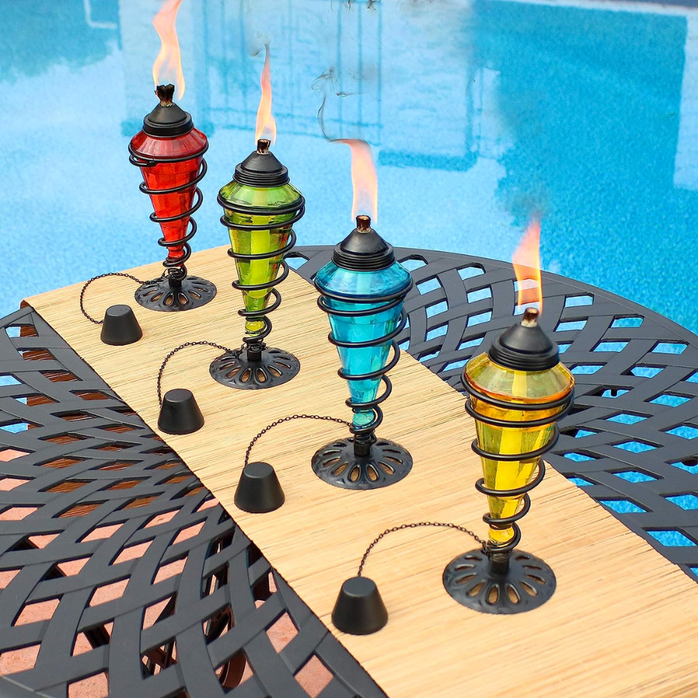 Transform your outdoor space into a mesmerizing oasis with the Sunnydaze Swirling Metal Tabletop Torches! This set of four torches is perfect for adding a touch of ambiance to your evening. The colorful glass provides a decorative touch while the metal snuffers make it easy to extinguish the flame when you're done. With its lightweight design and 8 oz fuel tank, these torches are sure to light up your night!