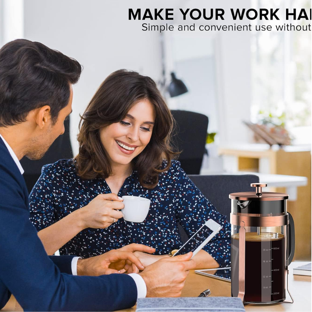 Get the perfect cup of coffee every time with QUQIYSO's French Press Coffee Maker! Our innovative design is simple and easy to use, saving you time, space, and money compared to a complicated coffee setup. Plus, our high-quality borosilicate glass is heat-resistant and won't shatter like glass. And our 4-layer stainless steel filter ensures no grounds end up in your cup.
