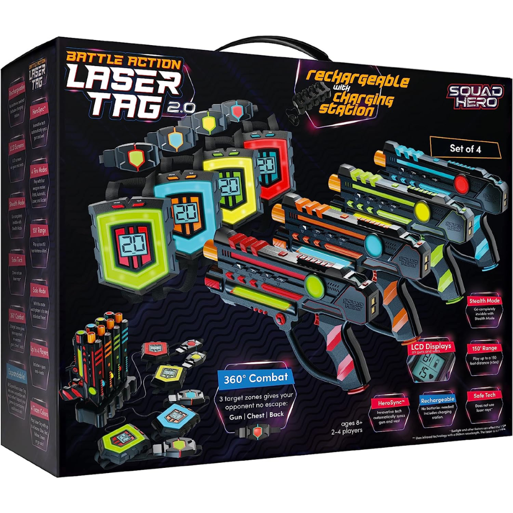 Get ready for an epic battle with Squad Hero's Rechargeable Laser Tag Set! With 4 guns, 4 vests (front and back), and one charging station, you can transform your backyard into a war zone. Take aim, hide, roll and eliminate your enemies with this ultra-hi-tech laser tag set. Lock 'n load for hours of endless fun and excitement!